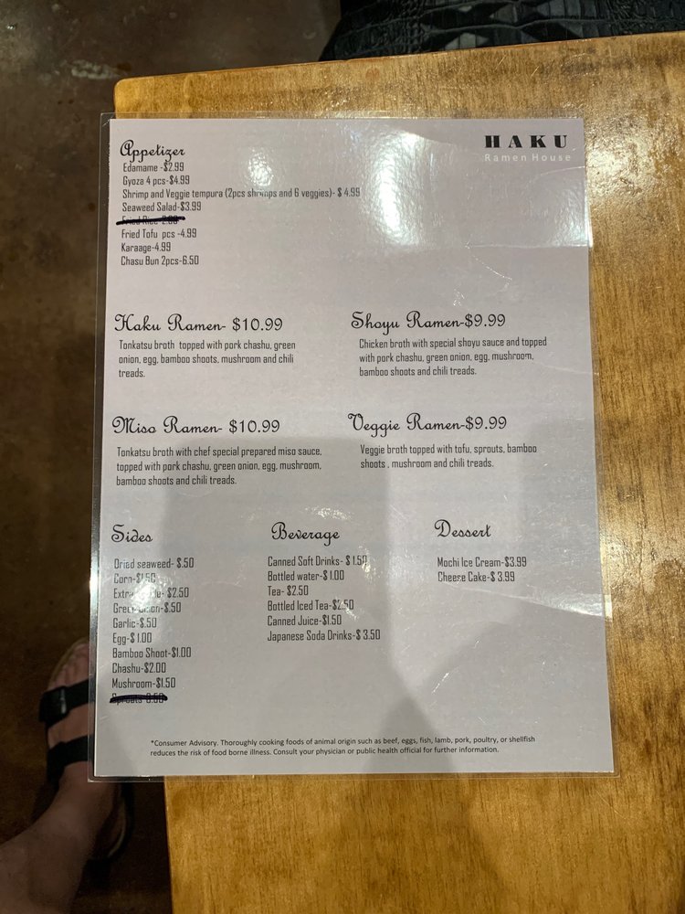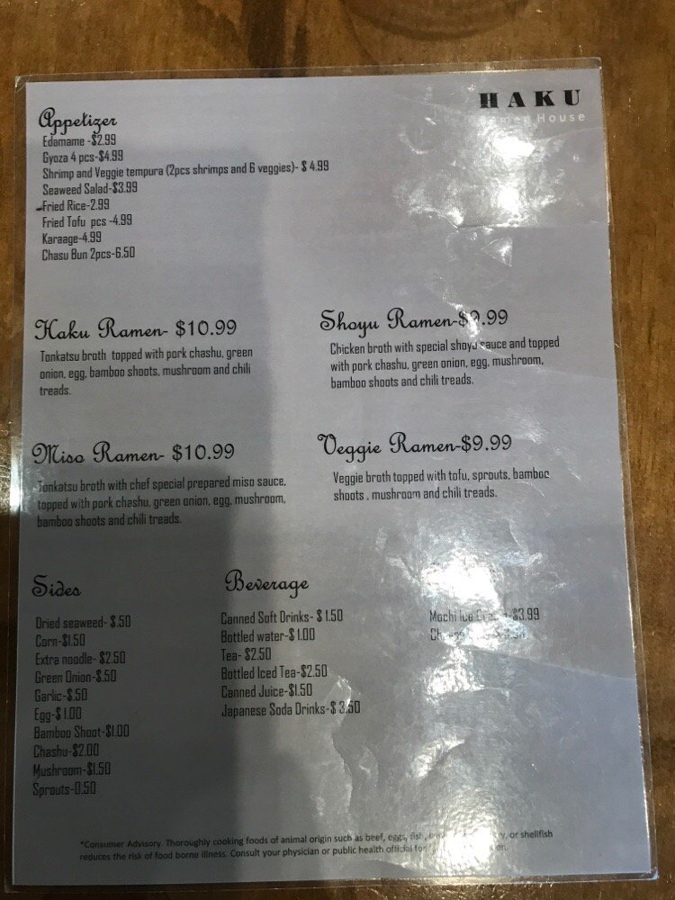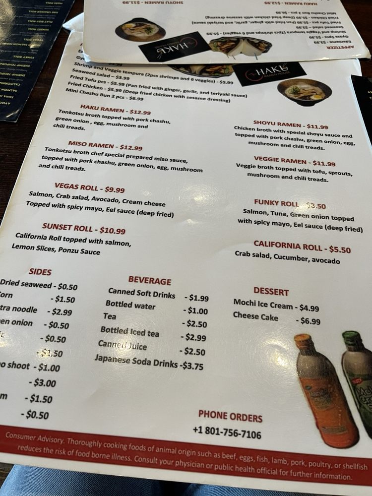 Introducing the menu at Haku Ramen House in American Fork, UT. Specializing in various ramen dishes, from Tonkotsu to Miso and Shoyu, with vegetarian options available. Appetizers like Mini Chashu Bun and Gyoza are also on offer. Customers rave about the attentive service and delicious food, highlighting the flavorful broth, tender pork, and perfectly cooked noodles. The cozy ambiance with anime vibes adds to the dining experience. Don't miss out on the unique mural and happy hour specials. Whether you're a ramen enthusiast or sushi lover, Haku Ramen House is a must-visit spot for Japanese cuisine in Utah.